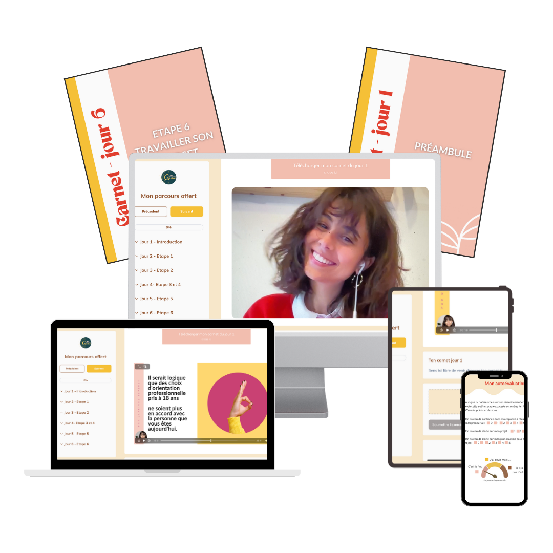 - 6 carnets d'accompagnement pour ancrer tes découvertes et avancées et la possibilité de me les envoyer pour analyse,